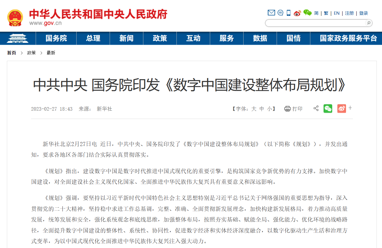 根據(jù)新華社報道,近日,中共中央、國務(wù)院印發(fā)了《數(shù)字中國建設(shè)整體布局規(guī)劃》。《規(guī)劃》涉及數(shù)字經(jīng)濟、數(shù)字政務(wù)、數(shù)字社會、數(shù)字文化以及數(shù)字生態(tài)文明等方面的內(nèi)容,這將對智慧城市、未來社區(qū)建設(shè)產(chǎn)生重要影響.